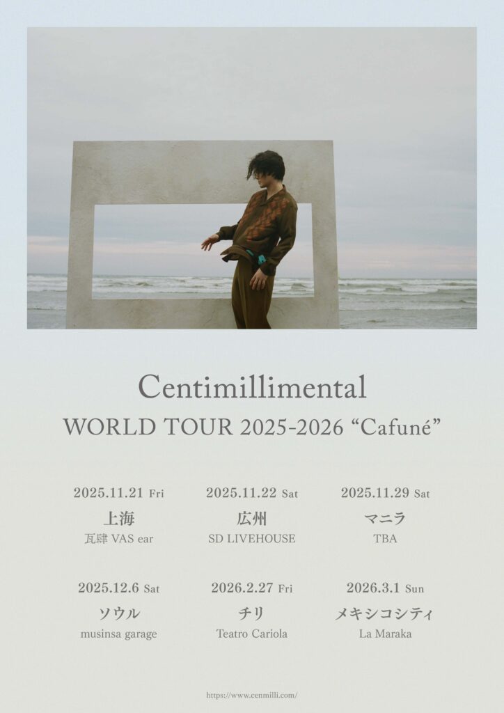 El músico japonés Centimillimental anunció este miércoles recién pasado, su primera gira mundial, titulada Centimillimental WORLD TOUR 2025–2026 «Cafuné», que comenzará el 14 de septiembre en Aichi, Japón, y llegará a varios países de Asia, y América Latina.